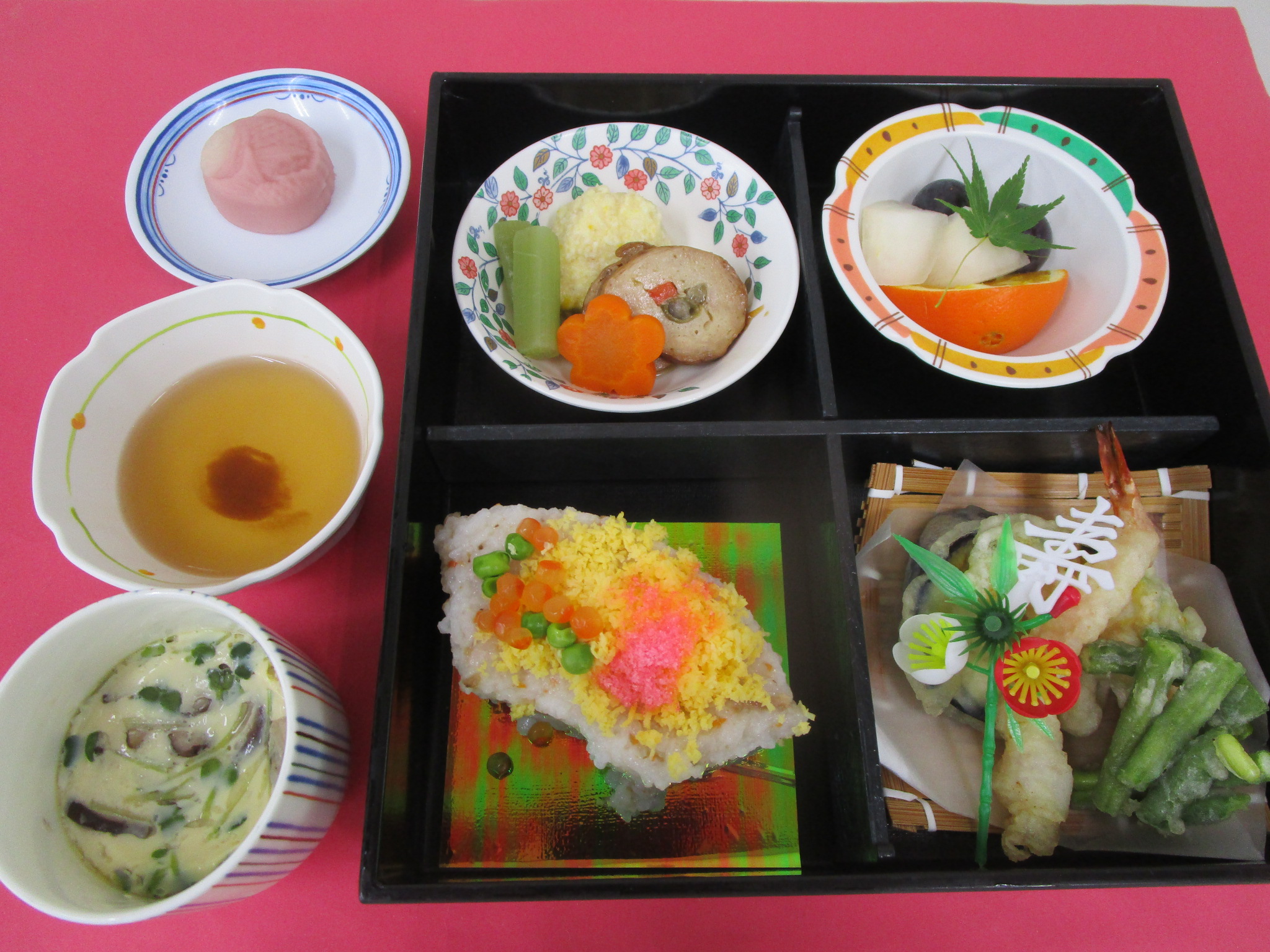 昼食には、ちらし寿司、天婦羅、茶碗蒸しなどの豪華なお祝い膳が振る舞われ、
