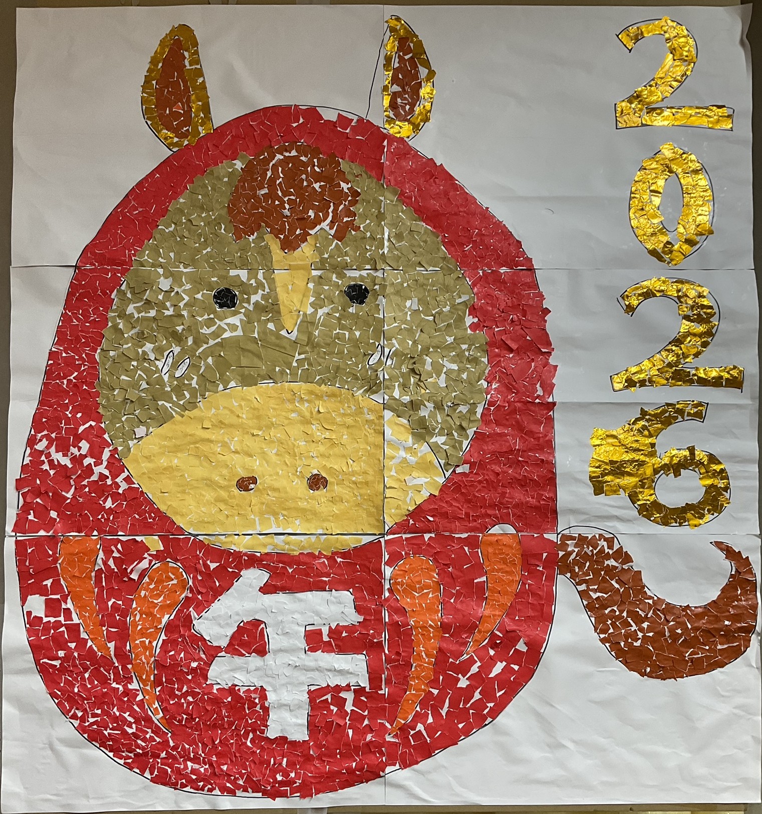 少数での活動の一環として、新しい年の干支「午」の巨大貼り絵制作に取り組みました。